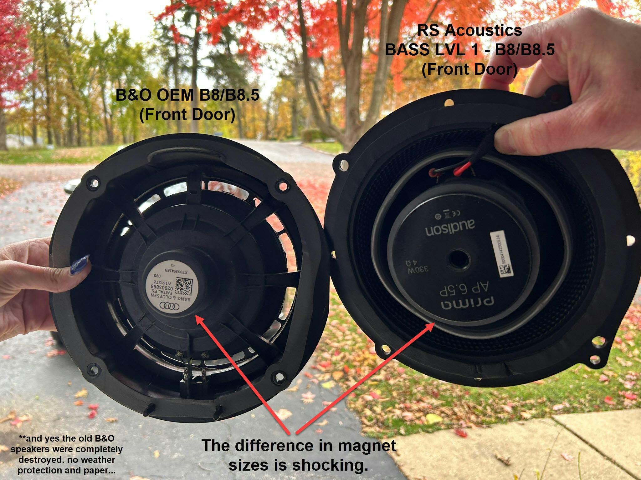 My stock door speakers in my 2014 Audi S5 were seemingly dry rotted or blown out when I bought the car. They rattled really bad with any bass. I bought the Bass LVL 1 speakers from RS Acoustics because I didn't want to mess around with wiring and fabrication, I just wanted to get the job done. These speakers feel like quality and they were truly plug-and-play. I was a little nervous as there were no reviews but I would definitely recommend. Bass is clean and much better. I will likely go with RS Acoustics for the dash speakers as well since the stock B&O system is honestly pretty tinny and too treble-harsh.